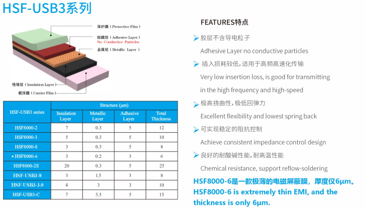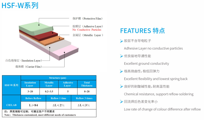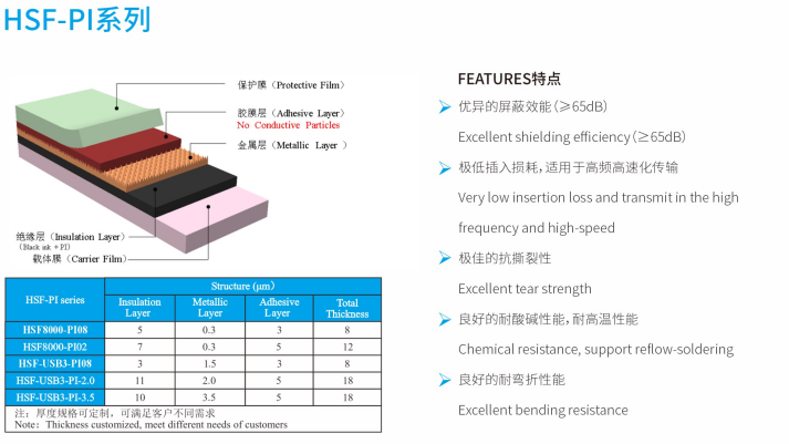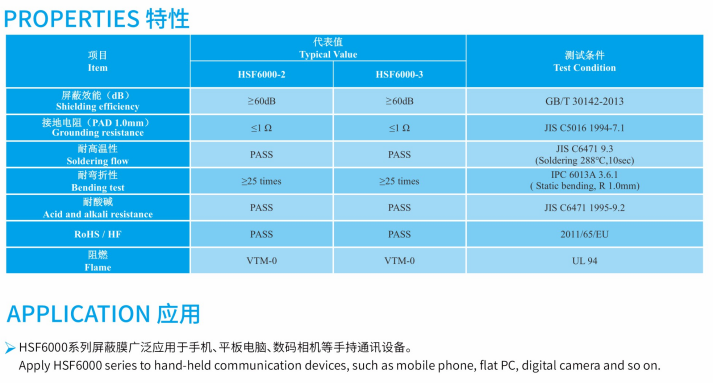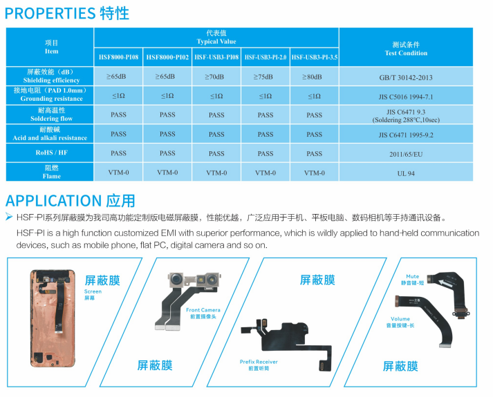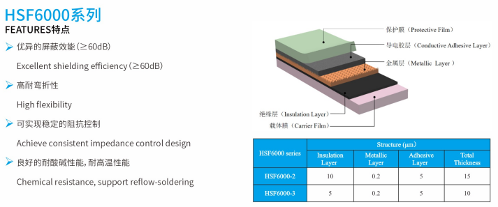 HSF series electromagnetic shielding film were produced from Guangzhou Fangbang Electronics Co., Ltd, which can keep signal transmission of high frequency integrity and effectively shield the EM wave. HSF series were provided with excellent flexibility, lower insertion loss, superior SE, consistent impedance control and so on. The films were dedicated for FPCB and R-F PCB.
