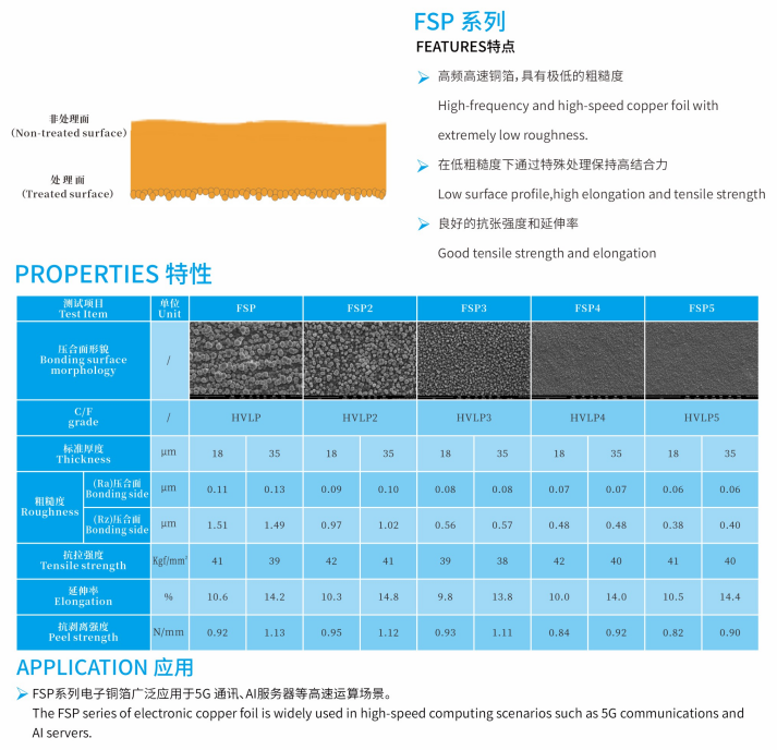 A high-end electrolytic copper foil developed in-house by the company,designed specifically for high-frequency,high-speed applications(e.g.,5G communication,Al servers,data centers). Its performance relies on two key innovations:an extremely low surface roughness to mitigate transmission losses at high frequencies,and specialized processing techniques that reconcile the inherent conflict between physical reliability and electrical performance.