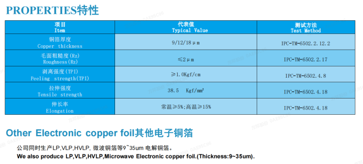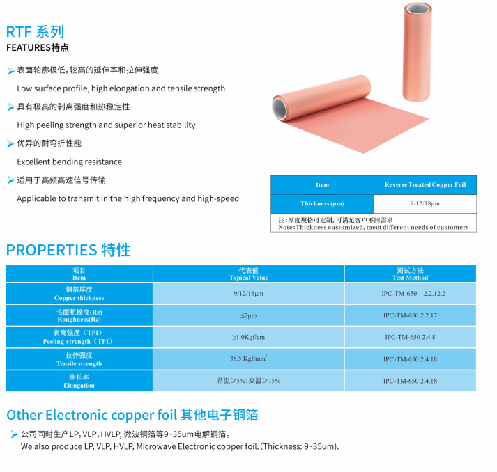 反转铜箔是公司自主生产的一种电解铜箔。其具有极低的表面轮廓,较高的延伸率和拉伸强度,极高的剥离强度和热稳定性等特点。 公司目前生产的反转铜箔规格主要有9μm,12μm 和18um。铜箔厚度均匀,微观晶体结构细密,可广泛应用于HDI、FPC、PCB、CCL、FCCL 等领域。
